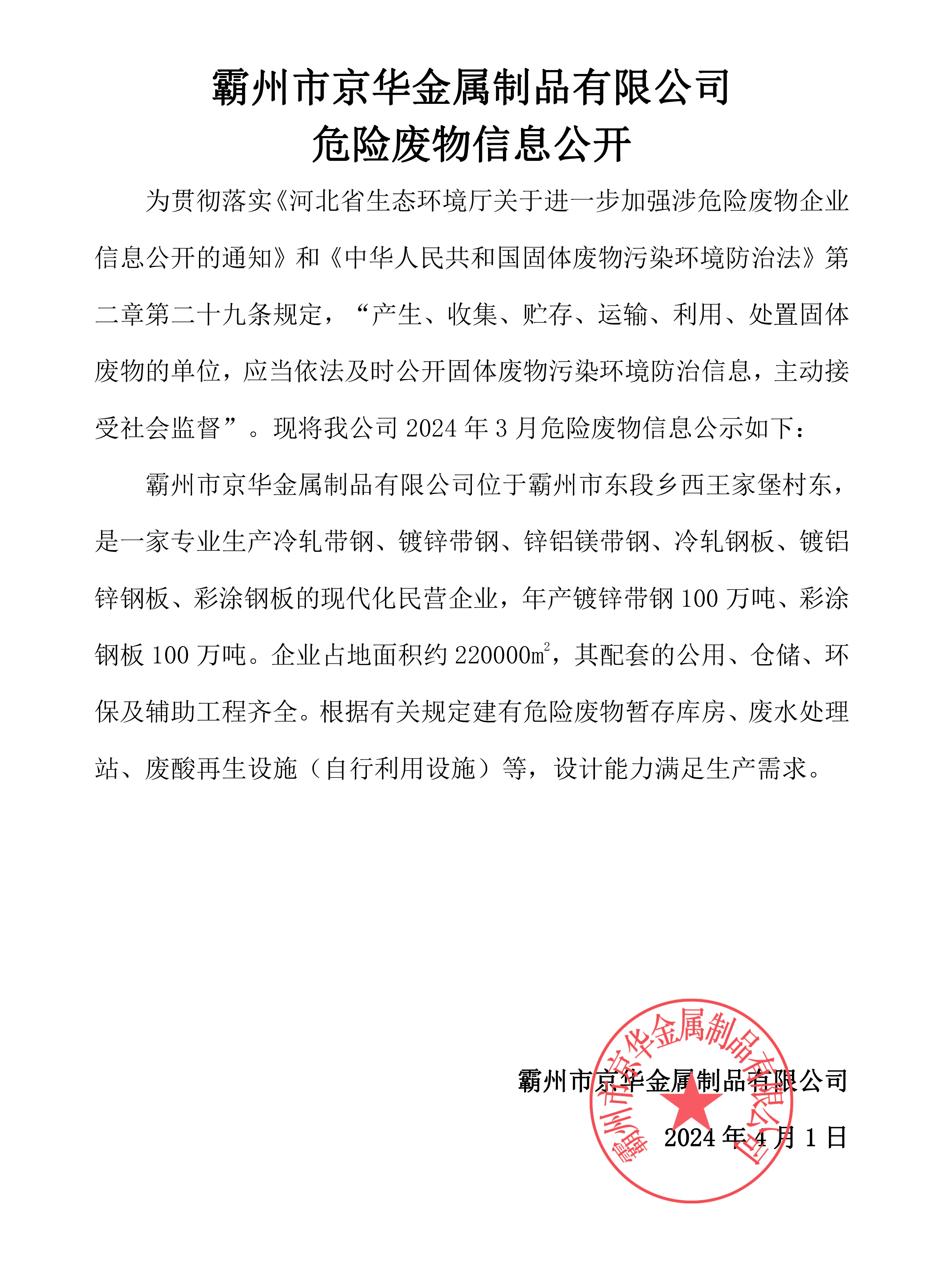 下一條:24年4月危險(xiǎn)廢物信息公開(kāi)-霸州市京華金屬制品有限公司