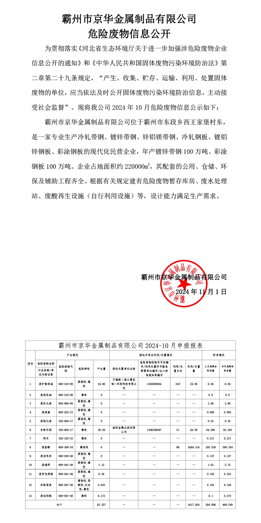 24年10月危險(xiǎn)廢物信息公開(kāi)-霸州市京華金屬制品有限公司